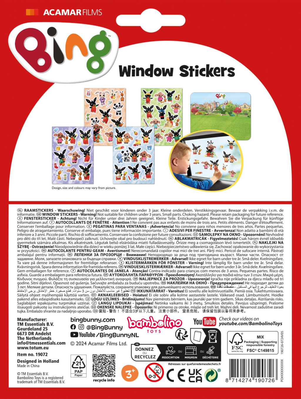 Σετ αυτοκόλλητων παραθύρου Bing με περισσότερα από 45 αυτοκόλλητα. Περιλαμβάνει 4 φύλλα και εικόνα για τοποθέτηση. Ιδανικό για δημιουργικό παιχνίδι.