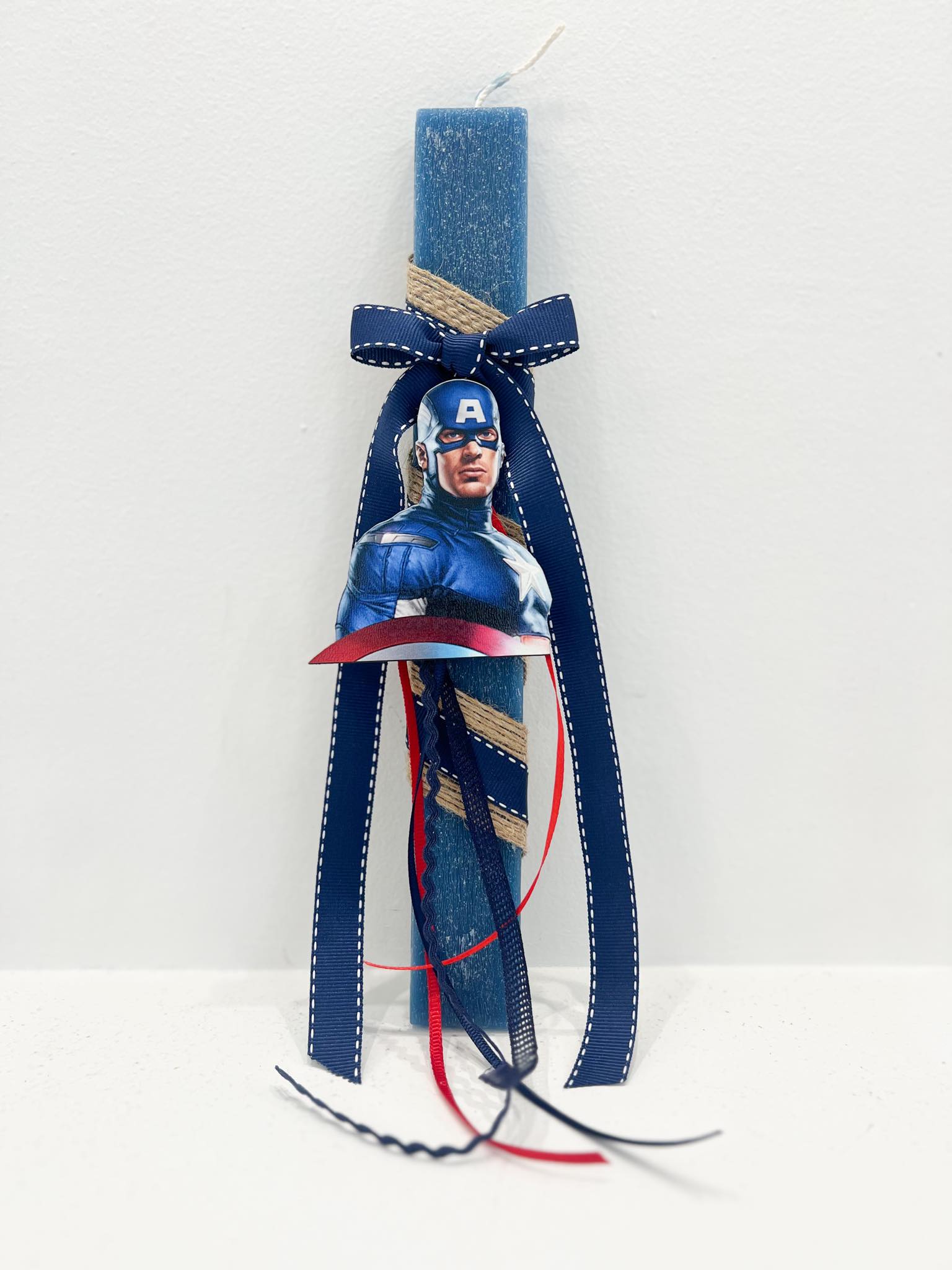 Χειροποίητη αρωματική πασχαλινή λαμπάδα με θέμα Captain America, διακοσμημένη με φιγούρα και κορδέλες. Ιδανική για το αγαπημένο σου βαφτιστήρι.
