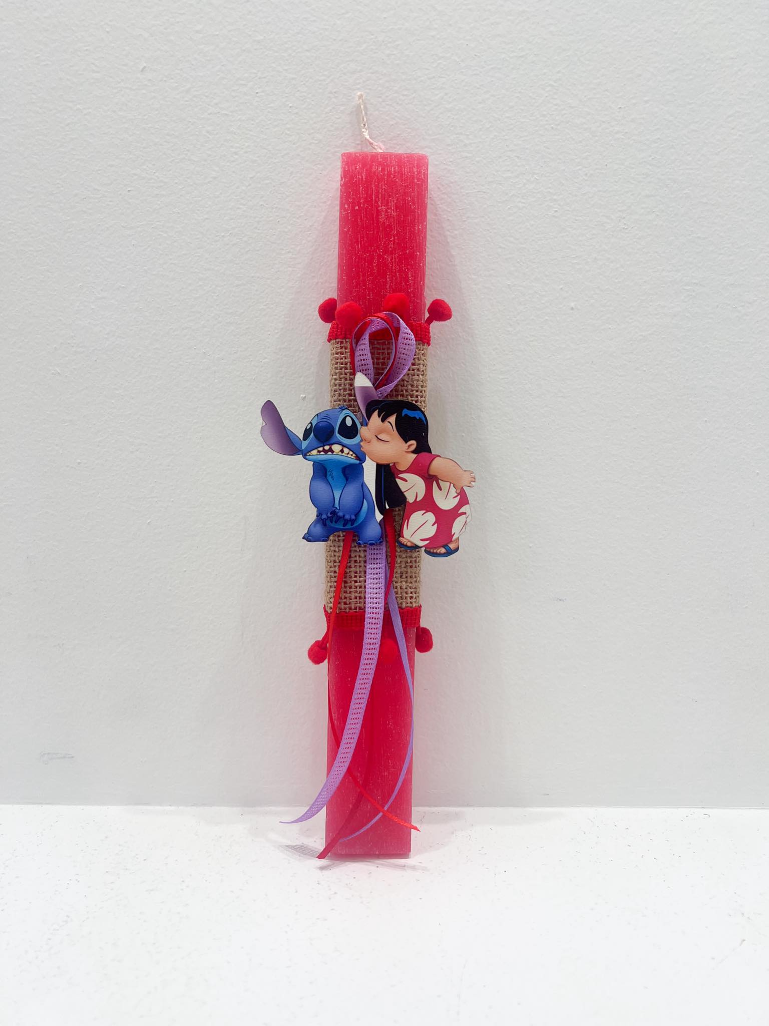 Χειροποίητη αρωματική πασχαλινή λαμπάδα με θέμα Lilo & Stitch, διακοσμημένη με φιγούρα και κορδέλες. Ιδανική για το αγαπημένο σου βαφτιστήρι.